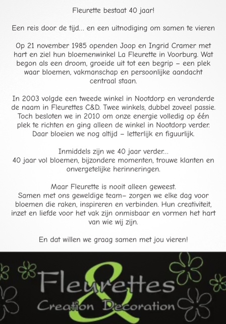 Onze zaak is er voor zowel particulieren als bedrijven. Wij richten ons op het exclusieve werk, tevens verkopen wij voor elk wat wils in diverse prijsklassen. De kracht van Fleurettes C&D is dat we eigentijds zijn. Bloemen zijn emotie en dat brengen wij graag over in onze passie voor het bloemenvak.